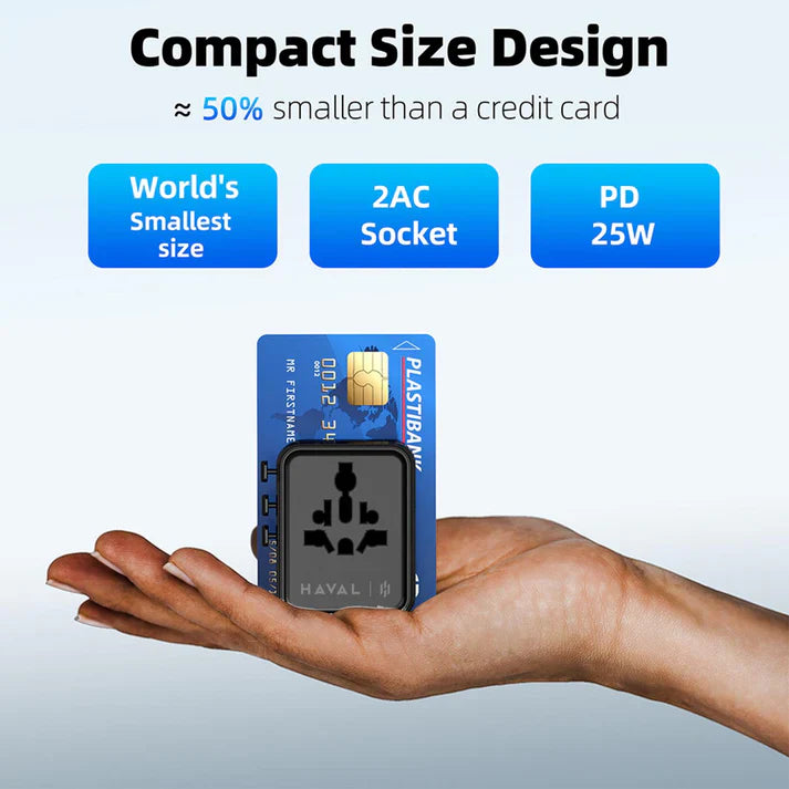 The HAVAL Universal Travel Adapter is the ultimate power solution for any traveler. Combining a universal AC socket compatible with 200+ countries and a powerful 25W integrated fast charger with multiple USB ports, this compact cube is all you need to keep your devices powered up around the world.