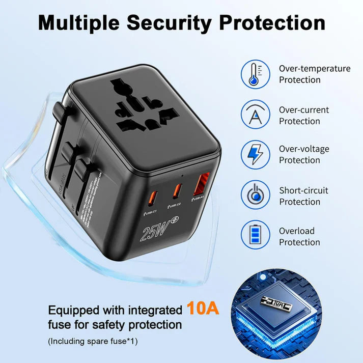Eliminate the clutter of multiple adapters and charging bricks. This powerful 25W travel charger features a complete charging solution: 2 dedicated USB-C ports, 1 standard USB-A port, and a universal AC power socket. Power up your entire tech ecosystem—laptop, phone, camera, and secondary devices—simultaneously and safely. Designed as the ultimate multi-travel adapter plug, it provides a seamless, one-stop power source for every trip.